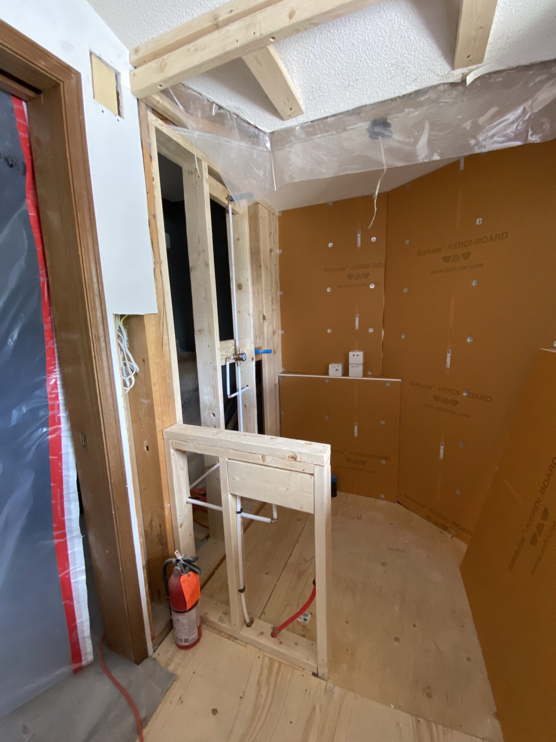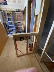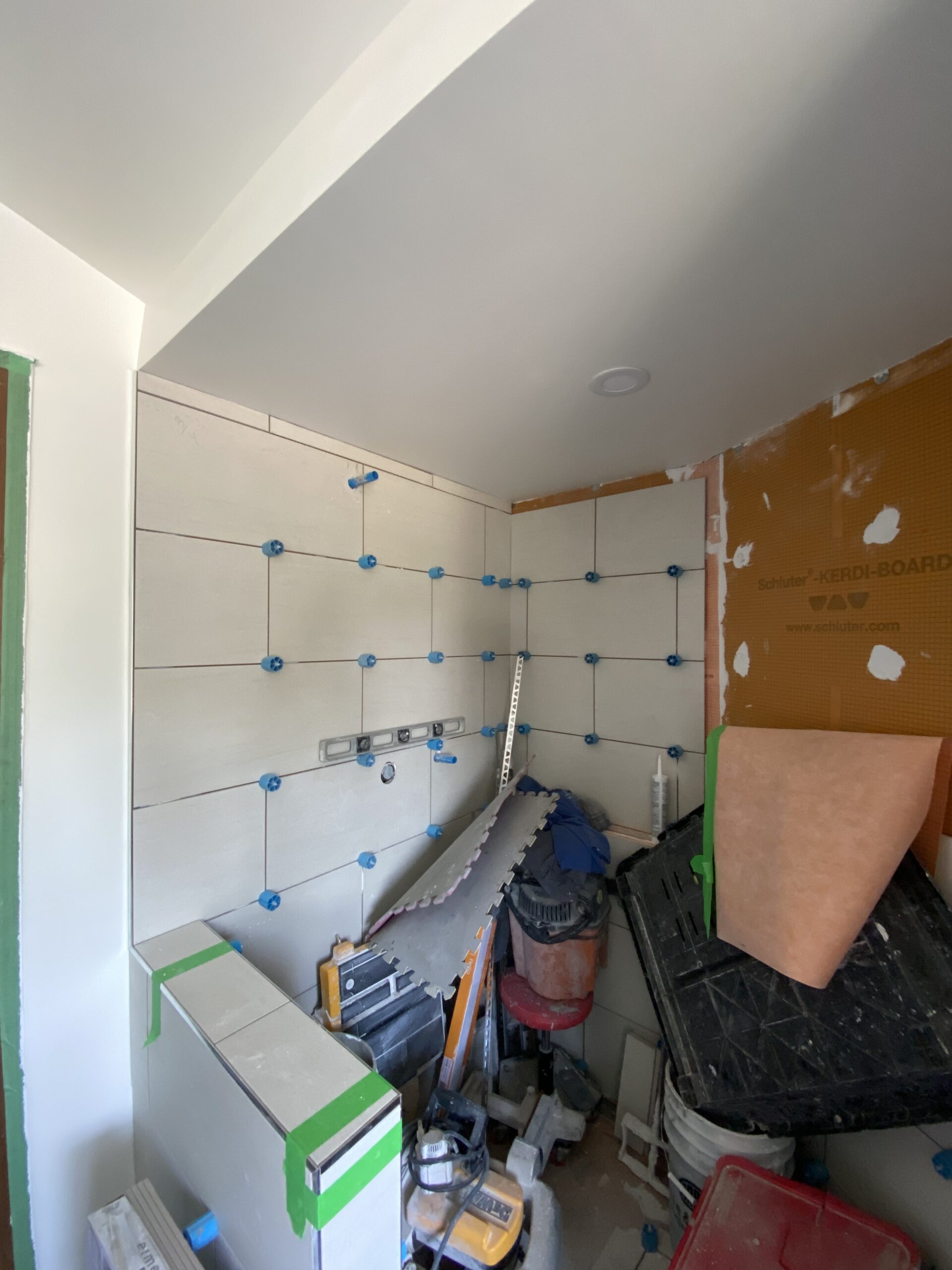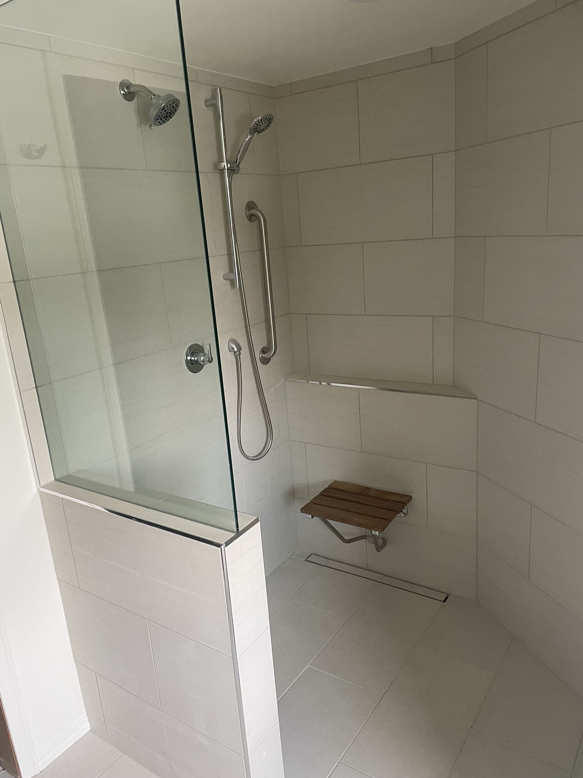 To meet these needs, ARK reconfigured the bathroom layout to create a larger, accessible shower, as well as installing two shower heads and multiple grab bars. This helped to create space in the new shower area to allow for safer support and use. We also relocated the vanity to the former shower location, and worked towards leveling the bathroom floor for easier access.